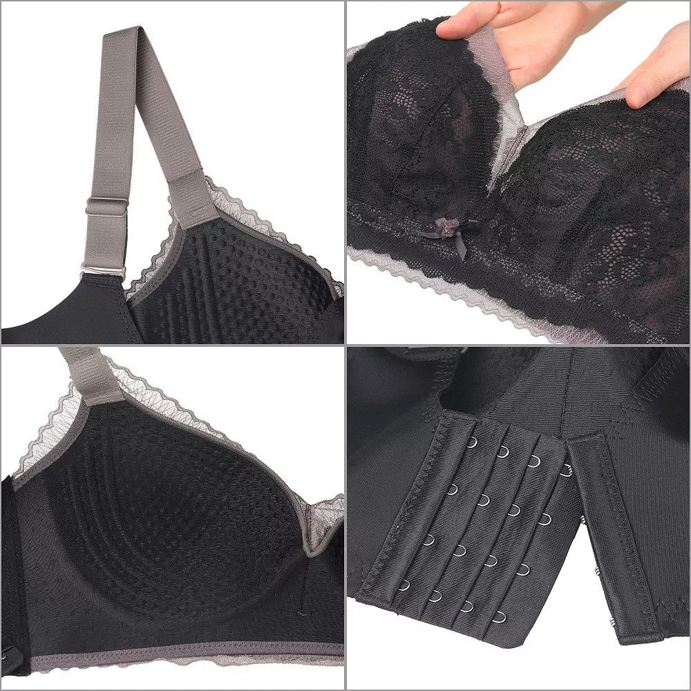 Our full figure bras for women make with smooth and soft stretch moisture wicking fabrics.The sexy lace double layer front and seamless back close women bras function are effective, better support, high comfort, ultra thin full cup, breathable and not stuffy, and has good sweat absorption and heat dissipation functions.The bra for lady with wide cushioned straps help ease pressure and relieve shoulder strain, with inside massage texture fabrics feeling more comfy.Adjustable hook and eye closure for superior comfort and custom feeling fit.It is recommended to wash light and dark clothes separately, Hand wash maximum washing temperature 40°C, Do not bleach, Line dring, Do not iron, Do not dry-clean.