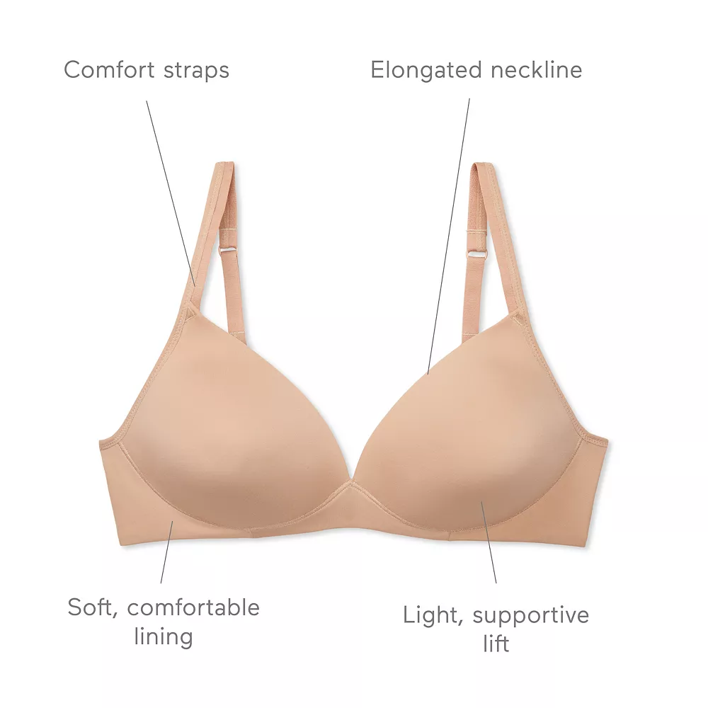 The light, supportive lift and elongated neckline make this Elements of Bliss® wireless t-shirt bra perfect for styling and support. Comfort straps and a super-soft lining make this bra an everyday favorite. That’s what we call bliss. Welcome to a better bra experience. When it comes to intimates, everyone needs something different. That’s why we made styles for every body. We’re simple solutions, made better.