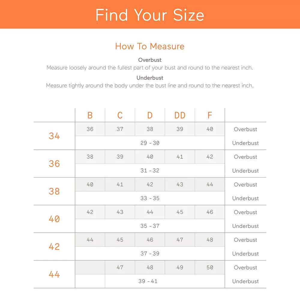 - 3-row closure: 38-40C, 36-40D, 34-38DD
